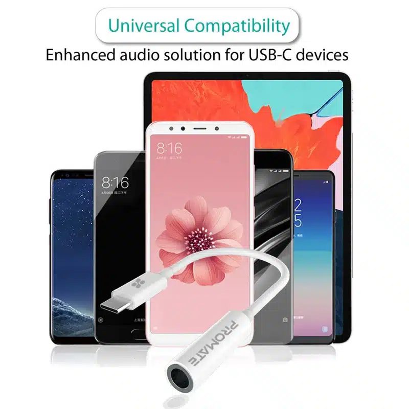 Add the 3.5mm jack back to your USB-C enabled devices missing the headphone jack. The Promate Dynamic Stereo USB-C to 3.5mm AUX Adapter (White) enables you to connect your 3.5mm headphones or earplugs to listen to music or answer phone calls. Compact and easy to use AUXLink-C is the accessory you need.